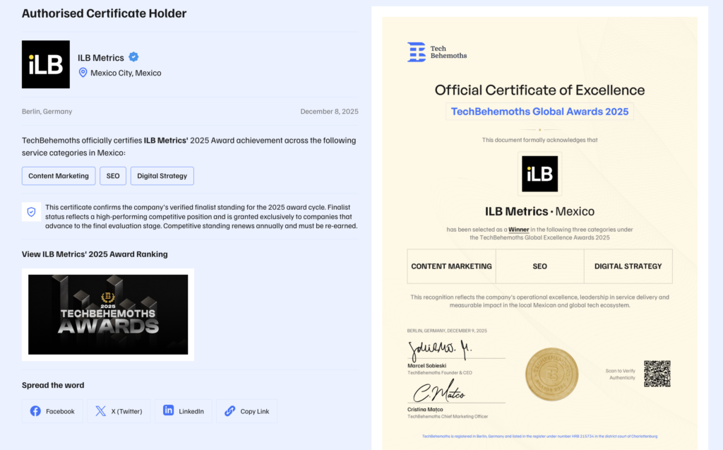 ILB Metrics, ha recibido el reconocimiento de los TechBehemoths Awards 2025 como empresa líder en las categorías de Content Marketing, Digital Strategy y SEO, la distinción más importante que otorga una de las plataformas de referencia global para empresas de tecnología y servicios digitales. Este galardón no es un hecho aislado: representa la consolidación de una trayectoria construida con datos, estrategia y un profundo conocimiento del consumidor latinoamericano.